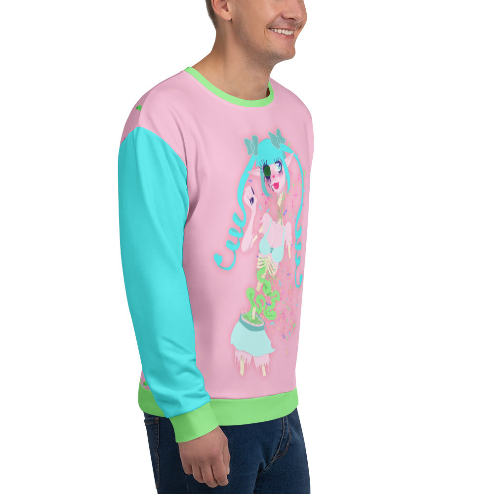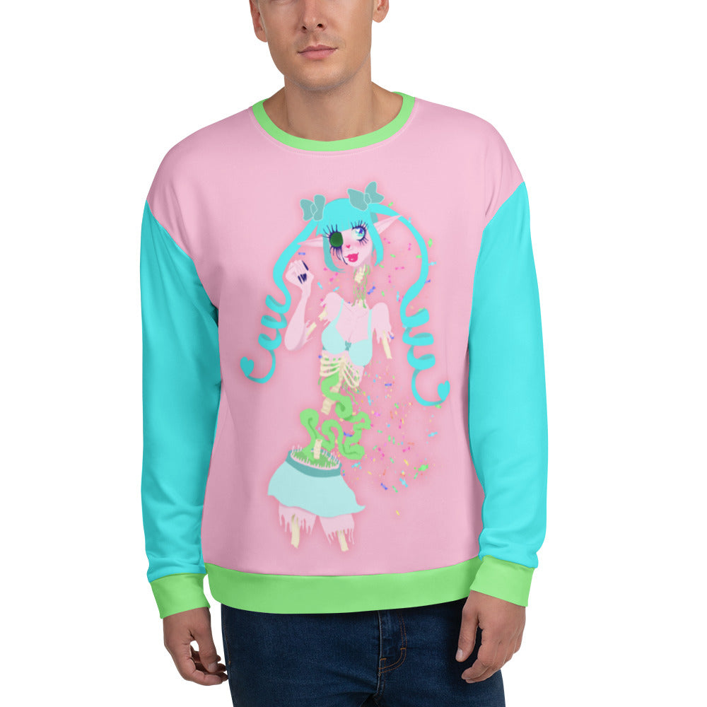 This sweatshirt features the original monster girl character Kandy, a candy zombie! Pastel and colorful cute horror vibes!