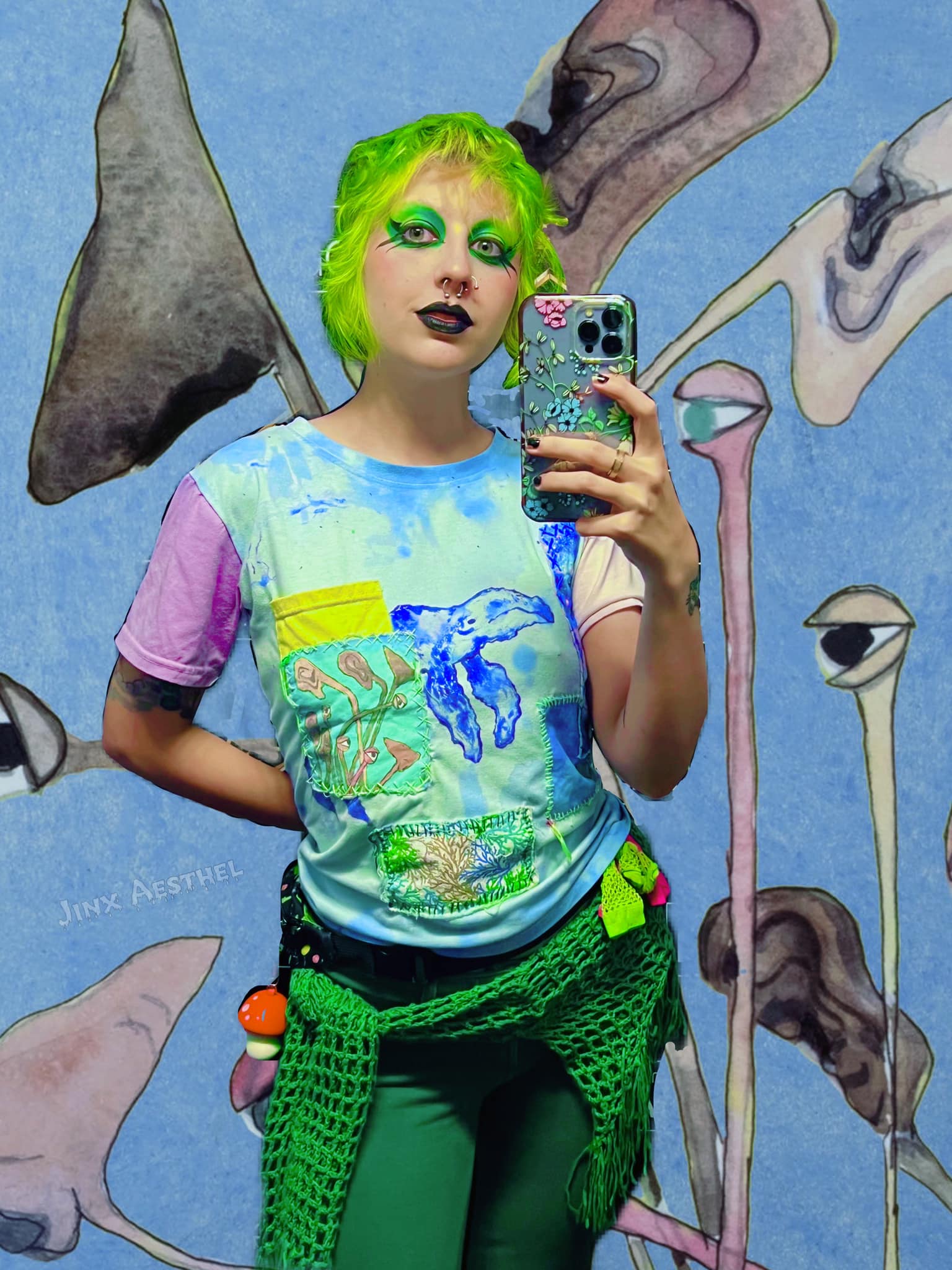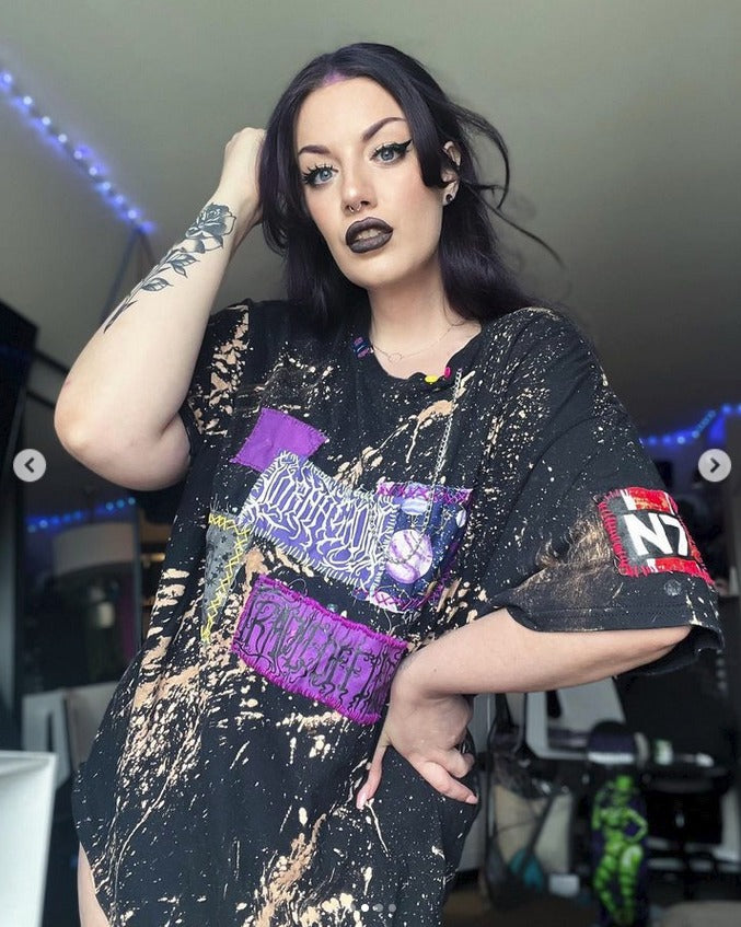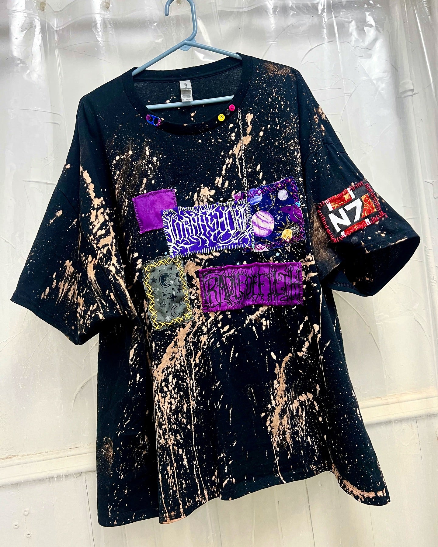 These shirts use Gildan tees as a base, decorated with hand painted patches, reclaimed/recycled fabric patches, buttons, pins, tab tops, chains, thread, and other patchwork details. These items are completely hand sewn and and take some time to create!