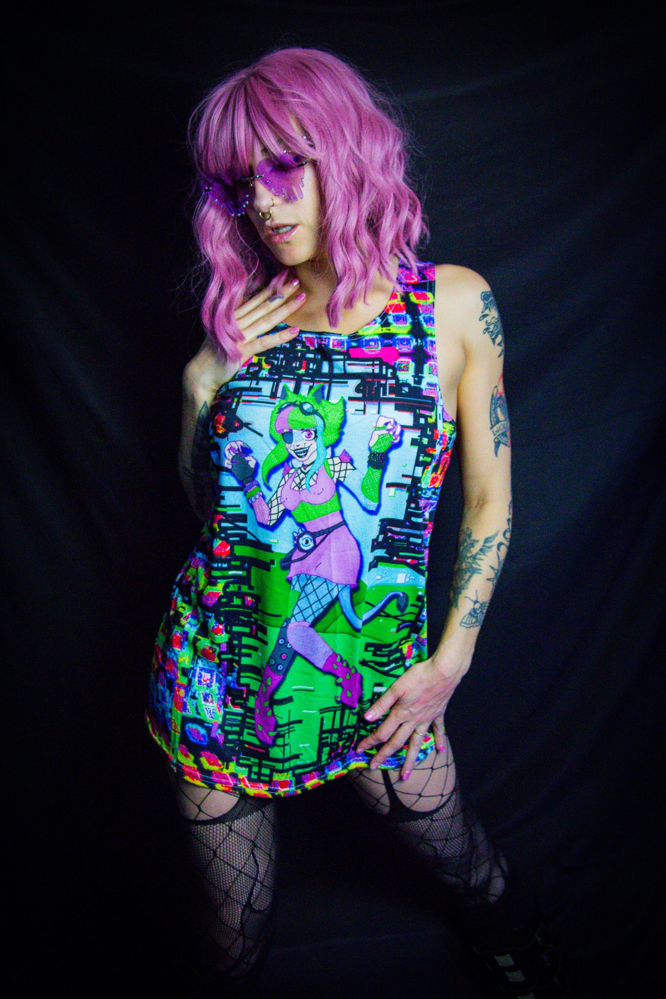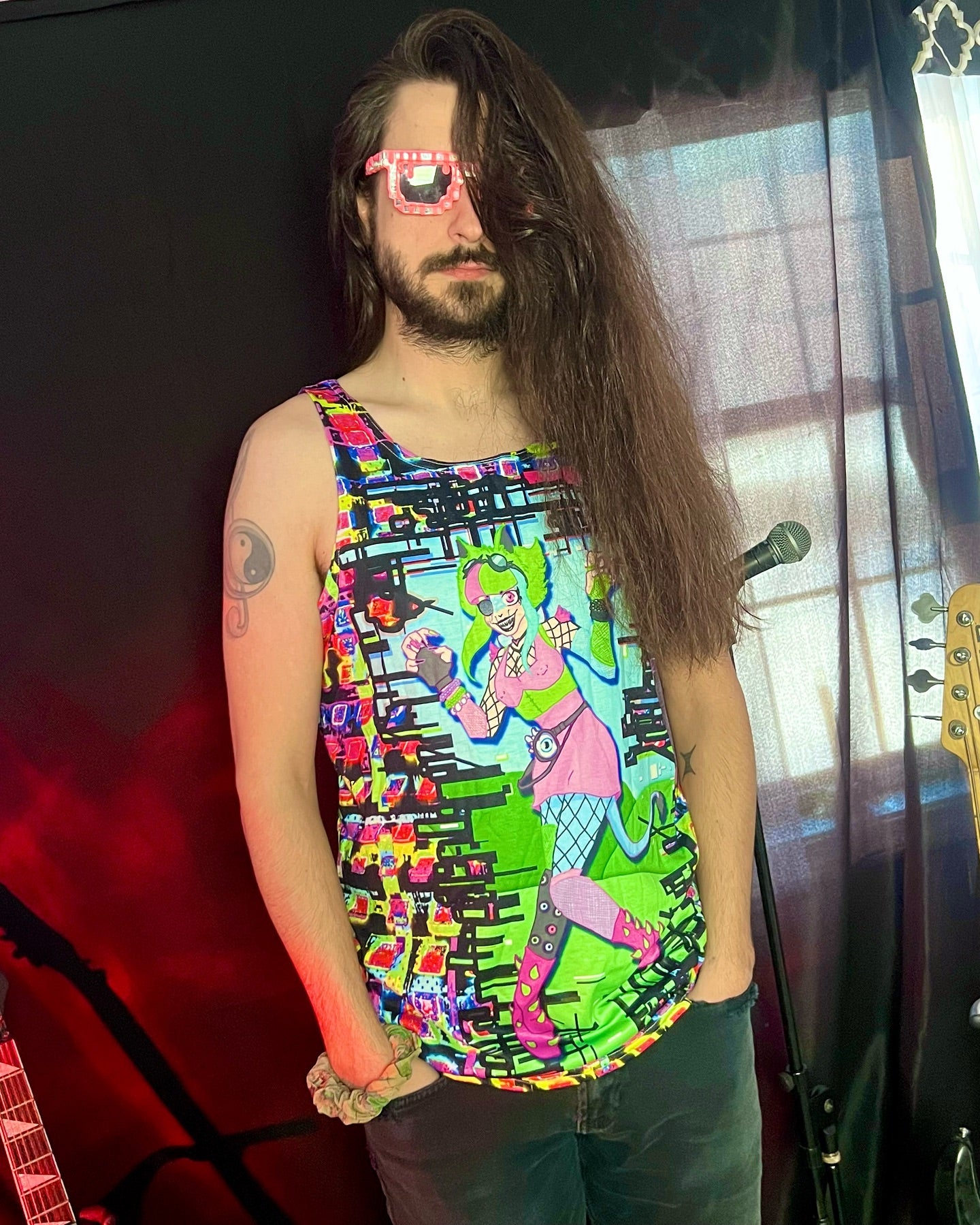 This unisex all over print tank top is printed with the non orthogonal glitch pattern and "Loopi" The glitch monster breaking through the data and jumping out of a dreamlike digital world!