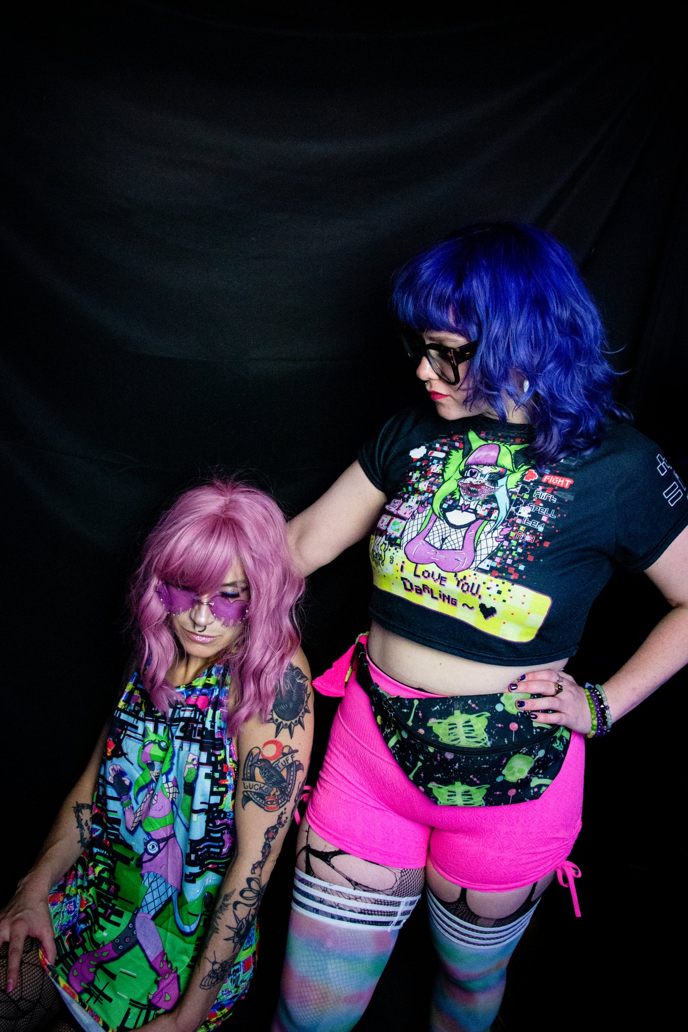 This crop top features the original character Loopi the glitch monster. This design is inspired by dating sim games, but in this one you've gotten the bad ending and Loopi is glitching out, crawling out of the game and coming to get you!