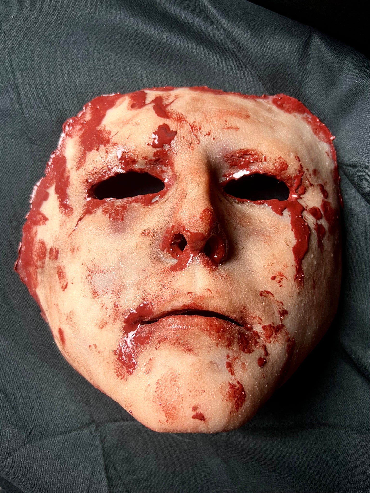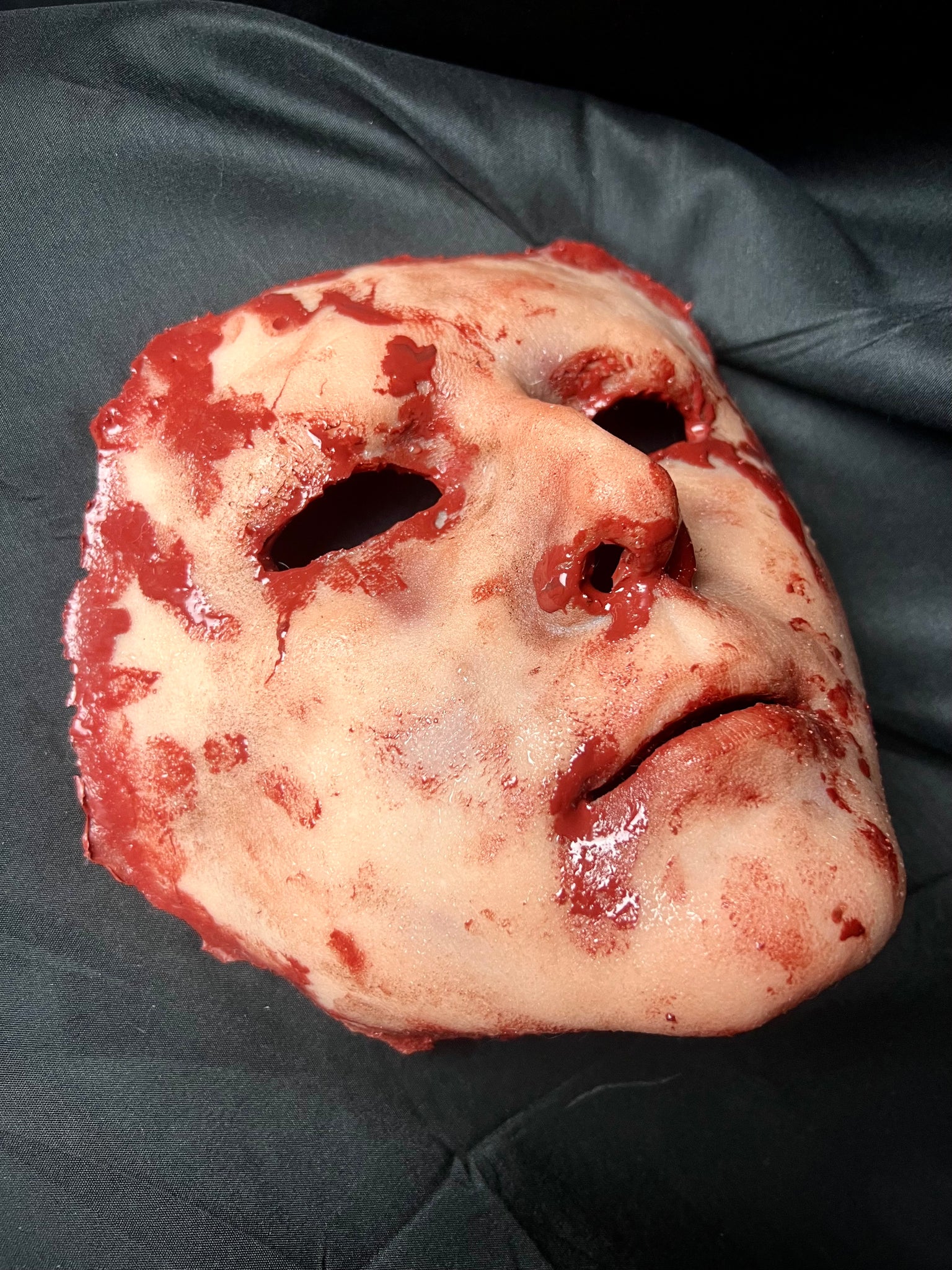 This silicone has lots of stretch, and to prevent tearing the mask has embedded anti-tear fabric around the outside edge as well as the corners of the eyes and the mouth. The coloring is all done with pigmented silicone, so it will never rub off or fade. The bloody edges and back side of the mask will always look wet!