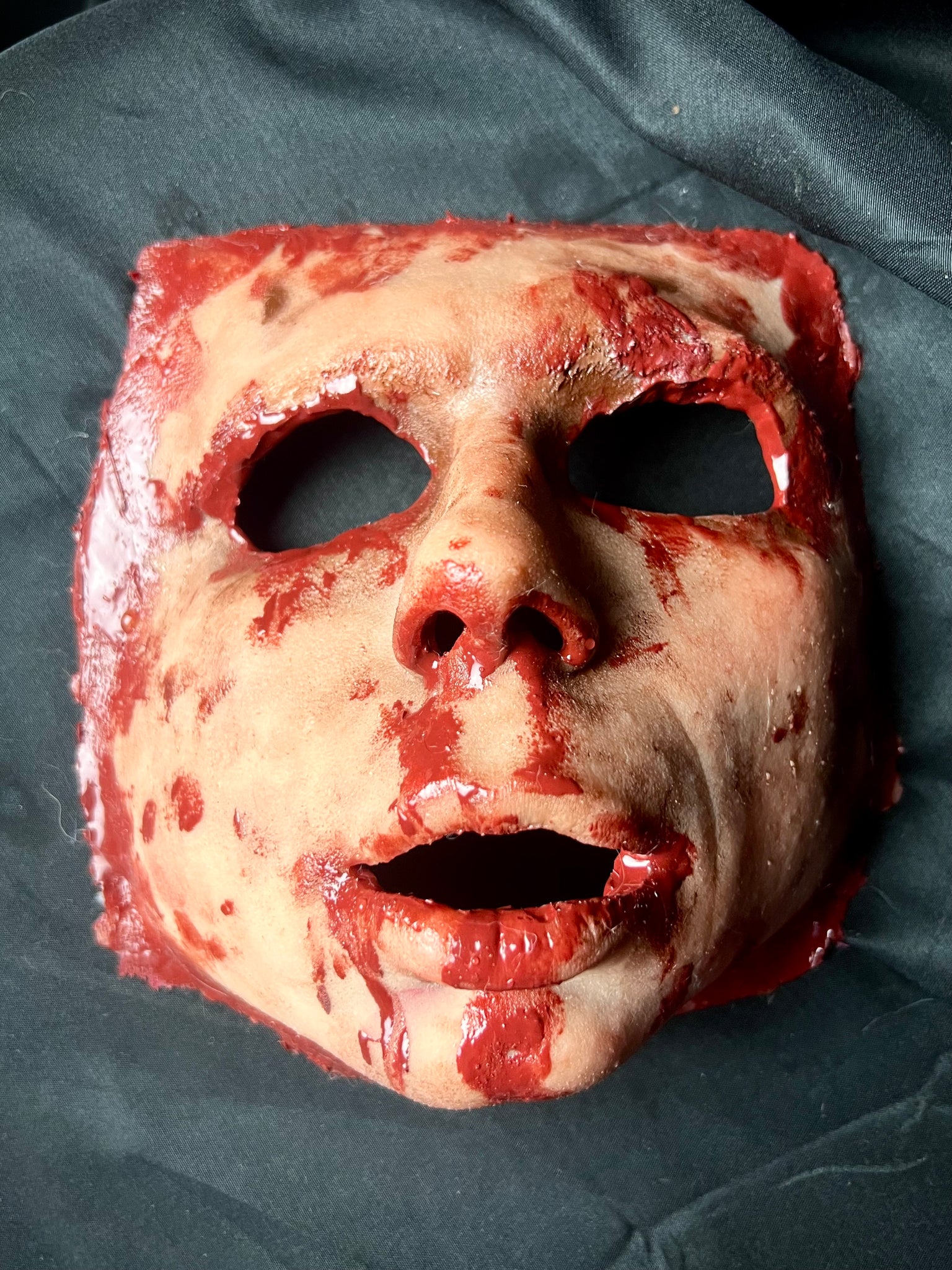 This silicone has lots of stretch, and to prevent tearing the mask has embedded anti-tear fabric around the outside edge as well as the corners of the eyes and the mouth. The coloring is all done with pigmented silicone, so it will never rub off or fade. The bloody edges and back side of the mask will always look wet!