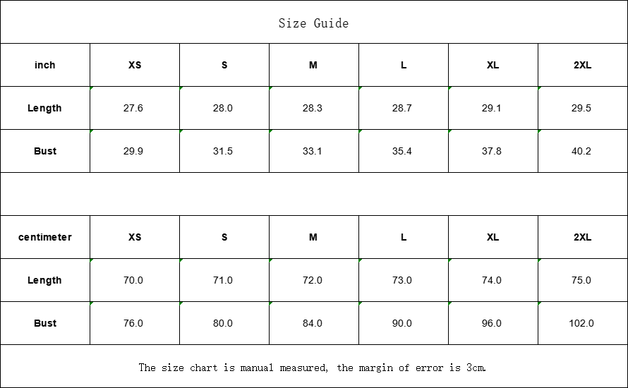 | Bust | 76.0 | 80.0 | 84.0 | 90.0 | 96.0 | 102.0 |